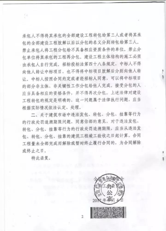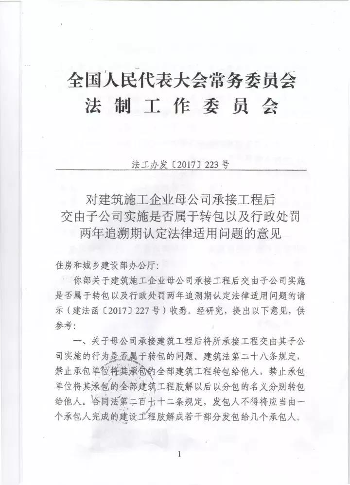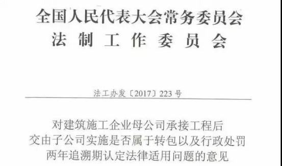 2017年,住建部曾向全國人大法工委發(fā)出請示函,全國人大法工委作出《對建筑施工企業(yè)母公司承接工程后交由子公司實(shí)施是否屬于轉(zhuǎn)包以及行政處罰兩年追溯期認(rèn)定法律適用問題的意見》(法工辦發(fā)[2017]223號,以下簡稱《意見》)認(rèn)為: